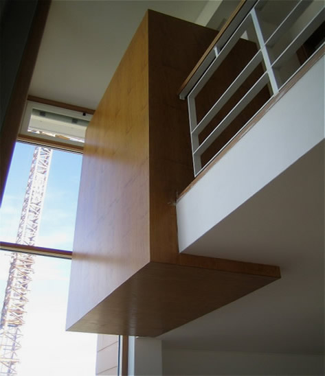 Os armários, no interior das bancadas, são em MDF hidrófugo laminado a mogno envernizado, contrastando com o branco da fibra de vidro e do corian. Todos os elementos de fixação, roda-pés e puxadores são em inox polido.As bancadas e a mesa do nível superior serão em pedra lioz, com a solução é desenhado um banco encastrado revestido a pele que dá apoio á área de refeições. O eixo (pilar) central que liga e gera todos os espaços, contêm no interior um elevador de pratos hidraúlico accionado por pistão, a base/prato do elevador é parte integrante da mesa de refeições e o acesso no nível inferior faz por uma portinhola colocada ao nível das bancadas, este núcleo central e a parede junto á zona de lavagem são revestidos a pastilha cerâmica branca. ![]() |