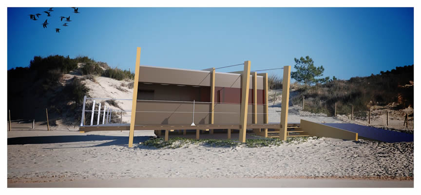| A construção consiste numa plataforma em deck de madeira sobre o qual assentam dois volumes, correspondentes às grandes opções do programa, um núcleo de instalações sanitárias e um núcleo de serviços que inclui o posto de primeiros socorros. Estes dois núcleos serão ligados fisicamente por um conjunto de asnas/pérgola em madeira que acompanham o perfil da cobertura de ambos os volumes, esta disposição dos elementos construtivos permite a criação de zonas mais reservadas (instalações sanitárias) e face às áreas disponíveis, a imagem de um conjunto mais harmónico. O conjunto de asnas/pérgola será saliente em relação aos alçados e cobertura prolongando-se para a esplanada por meio de um conjunto de cabos de aço e suportes inclinados em madeira. |